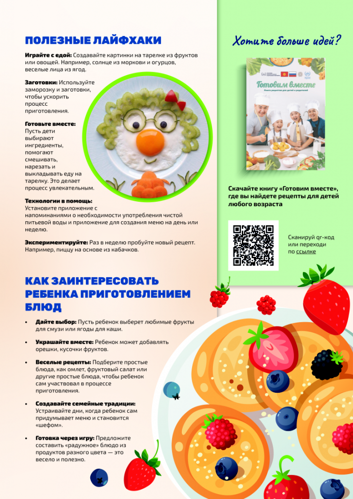 • Жөнөкөй үй шартындагы рецепттер: тамактар жеңил даярдалат жана балдарга жагат.